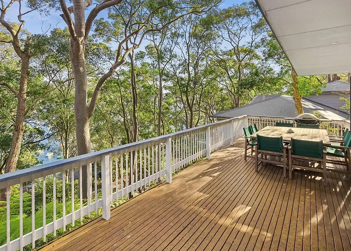 Situada a 3 km de la Playa Mona Vale, la villa Treetop Retreat Northern Beaches With Stunning Pittwater Bay Views Newport invita a los huéspedes a relajarse en una terraza.